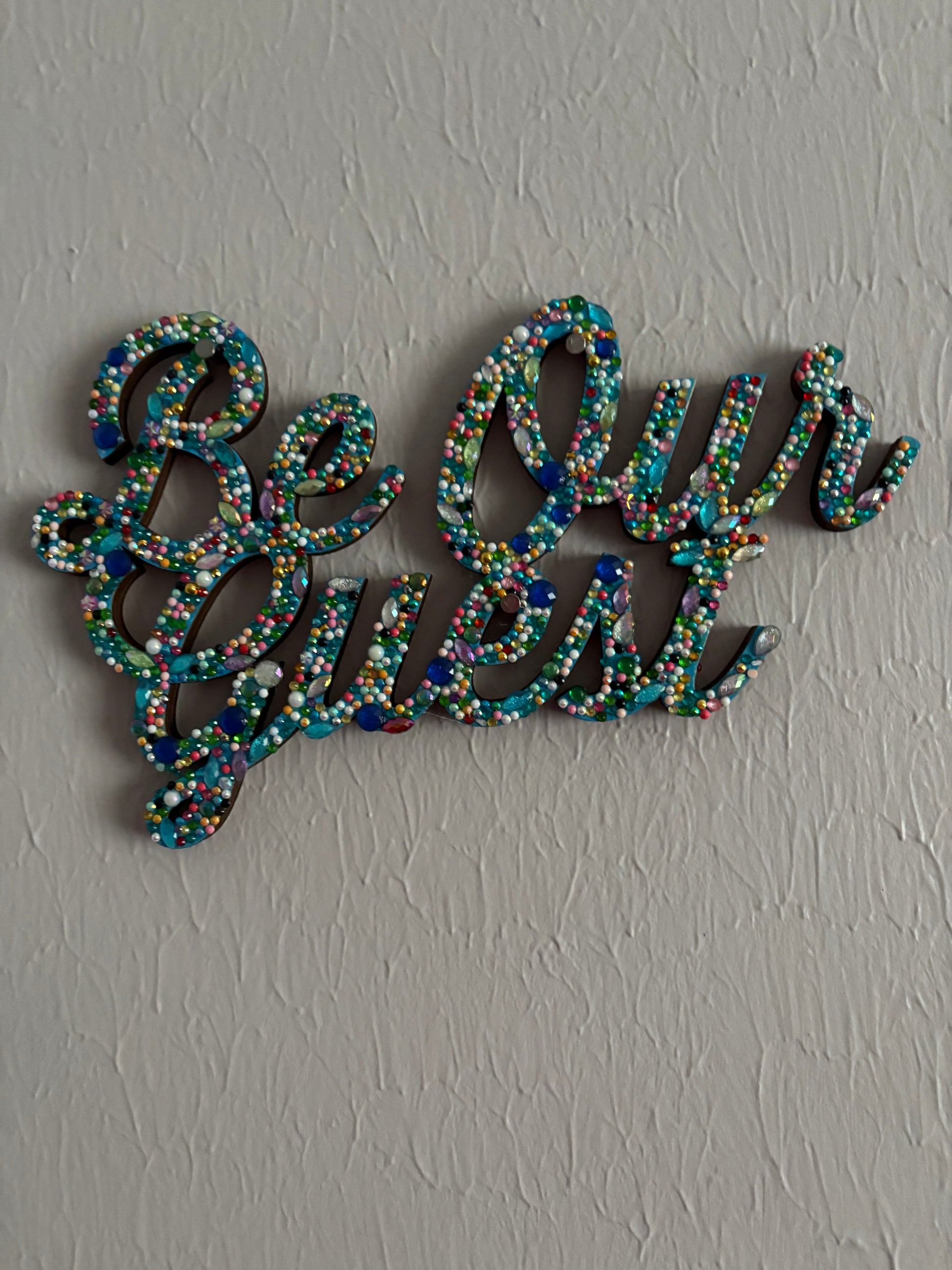 Welcome guests in style with this handcrafted Diamond Art wooden wall décor. The words “Be Our Guest” are brought to life with a dazzling mix of colorful rhinestones, creating a bright and cheerful statement piece that shines in any light. Perfect for an entryway, guest room, or dining area, this sparkling sign adds warmth and personality to your home.