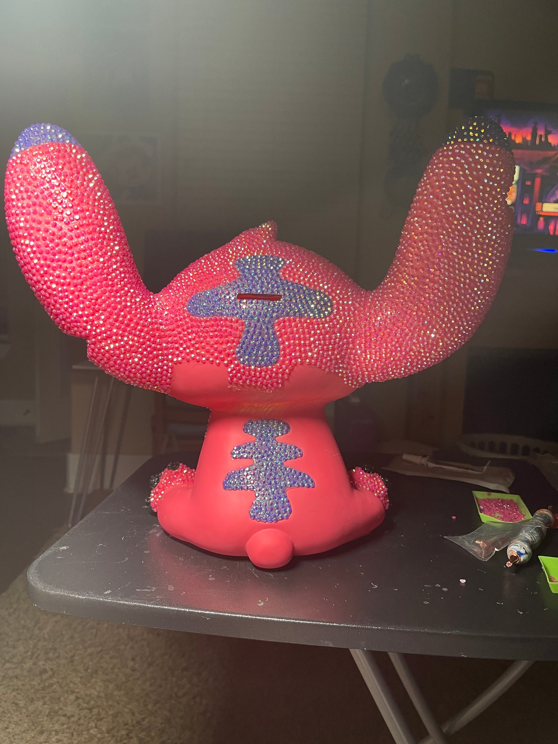 Save in style with this handcrafted Diamond Art 3D bank, designed in the shape of a Stitch-inspired character. Every inch is covered with sparkling rhinestones in bold pinks, purples, and blacks, creating a dazzling figure that doubles as both décor and a functional coin bank. With its big ears, bright details, and glittering finish, this piece adds fun and sparkle to any room.