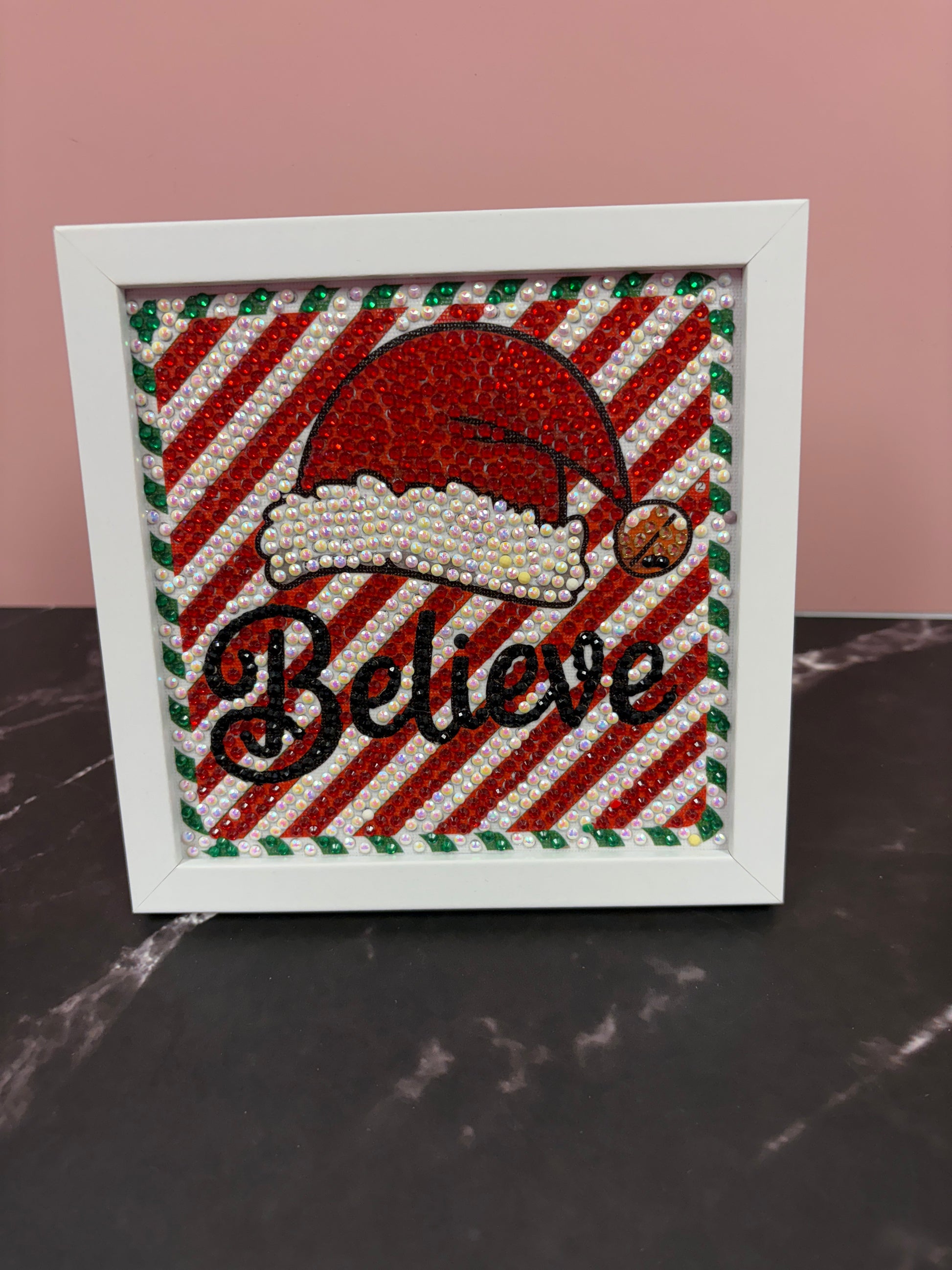 Bring holiday magic and sparkle to your home with this handcrafted Christmas Diamond Art wall décor. Featuring a festive Santa hat, the word “Believe,” and a candy cane striped background, this piece shines with hundreds of hand-placed rhinestones in bright reds, greens, whites, and dazzling iridescent accents. Set inside a white frame without glass, the texture and sparkle of the gems are fully on display—catching and reflecting light beautifully from every angle.