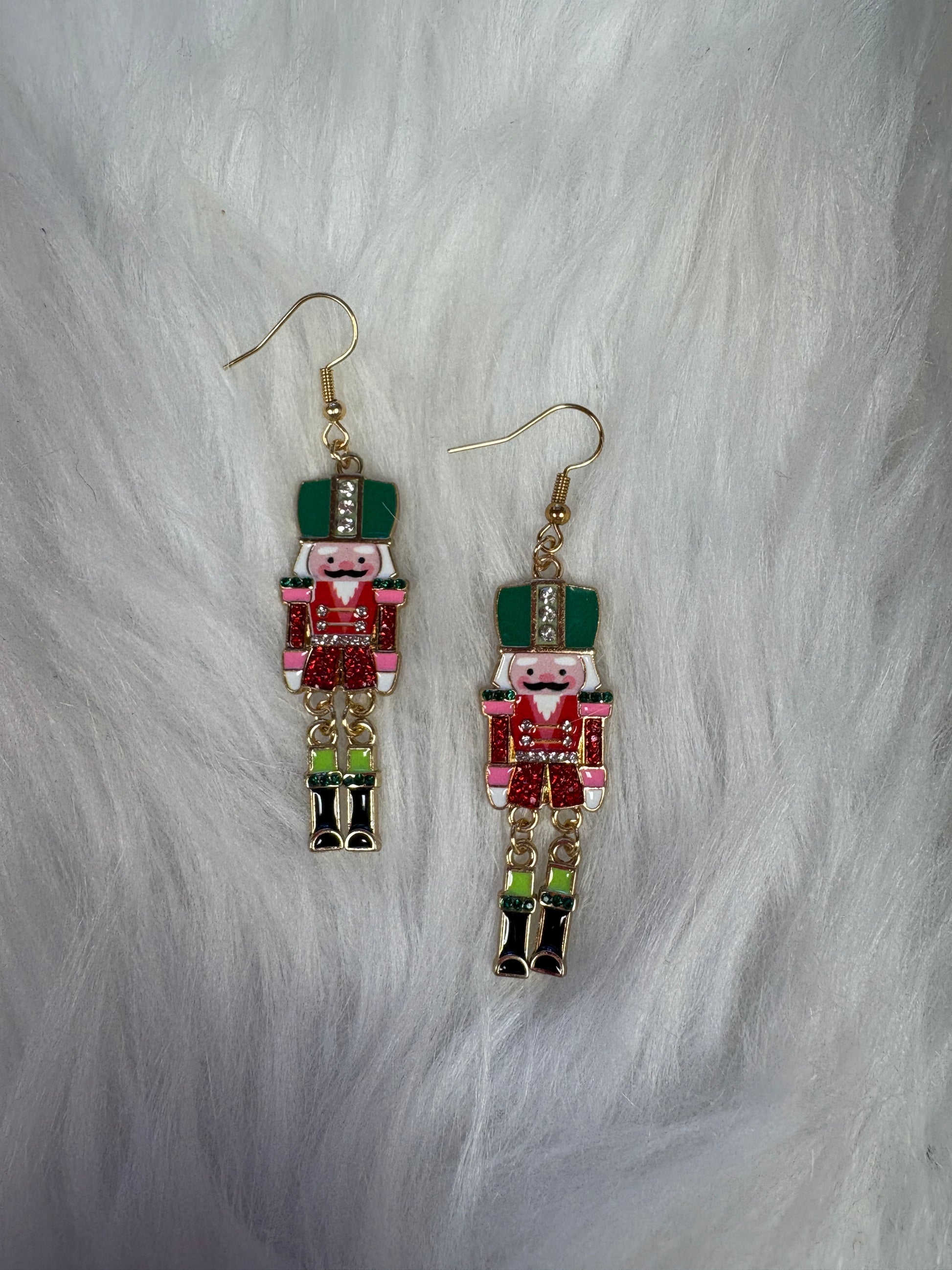 Bring the magic of the holidays to your look with these Nutcracker Soldier Wire Earrings. Each earring features a detailed nutcracker charm in festive red, green, and gold enamel, complete with sparkling rhinestone accents. The dangling leg design adds a fun touch of movement, giving these earrings a whimsical charm that perfectly captures the spirit of the season. Lightweight and eye-catching, they’re the ideal festive accessory for parties, concerts, or adding a bit of Christmas cheer to your everyday outfit.