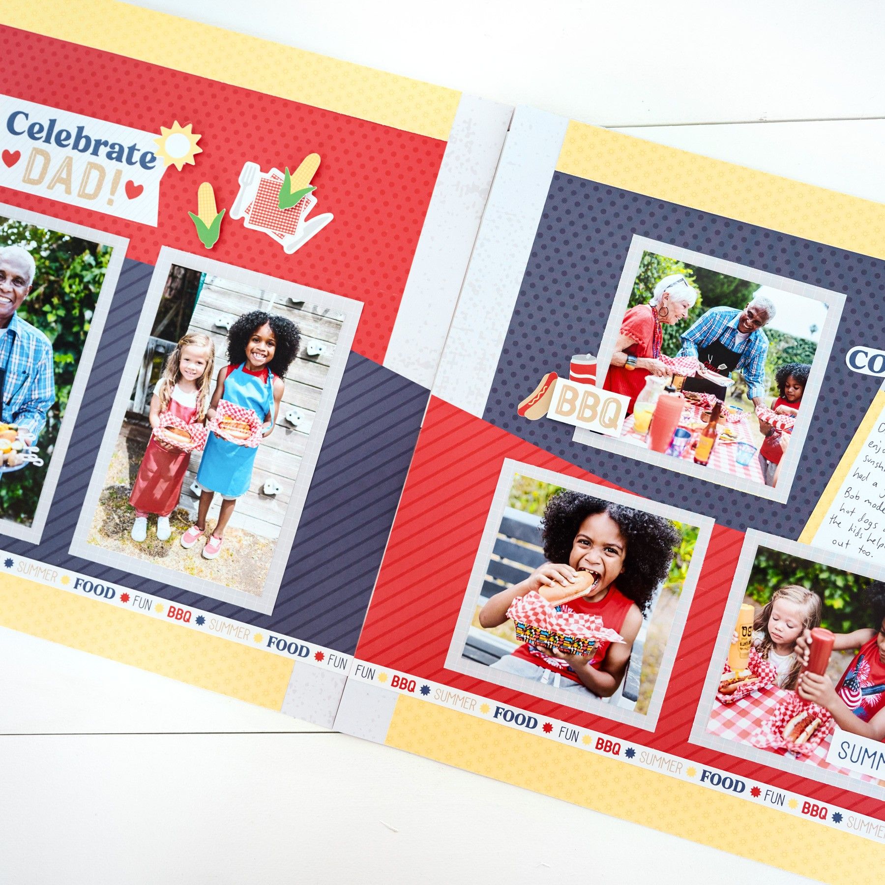 Simple Page Kit #6 includes space for five (5) photos and is the ideal way to create a layout that lets your summer memories shine! Inside this scrapbook layout kit, you'll find icons of watermelon, suns and picnics, as well as phrases like “Summer” and “Celebrate dad!” Follow the simple cutting guide instructions to create a beautiful cohesive spread!