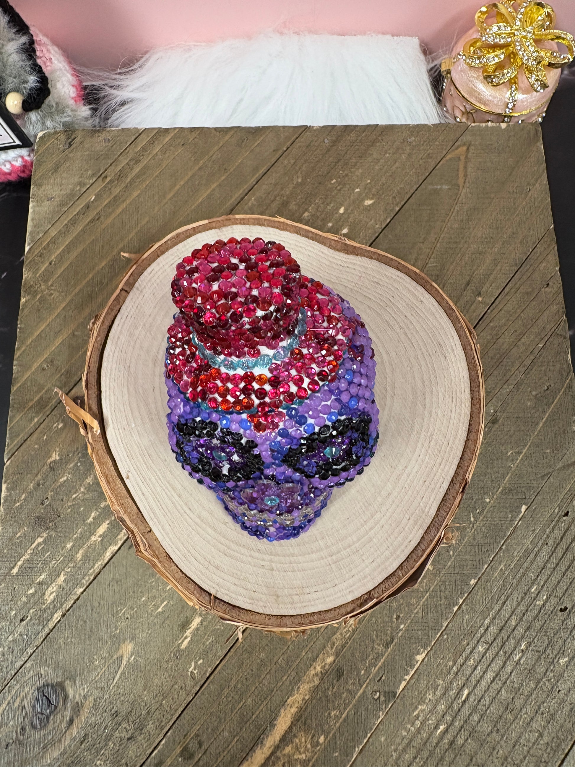 Add a festive shimmer to your décor with this handcrafted Diamond Art sugar skull figurine! Featuring a rich palette of purples, reds, blues, and blacks, this skull sparkles with thousands of rhinestones, each carefully placed by hand. Topped with a glittering red-and-teal top hat and accented with a delicate rhinestone flower, this piece is full of character and charm. Perfect for fans of bold décor, Día de los Muertos themes, or anyone who loves a touch of sparkle.