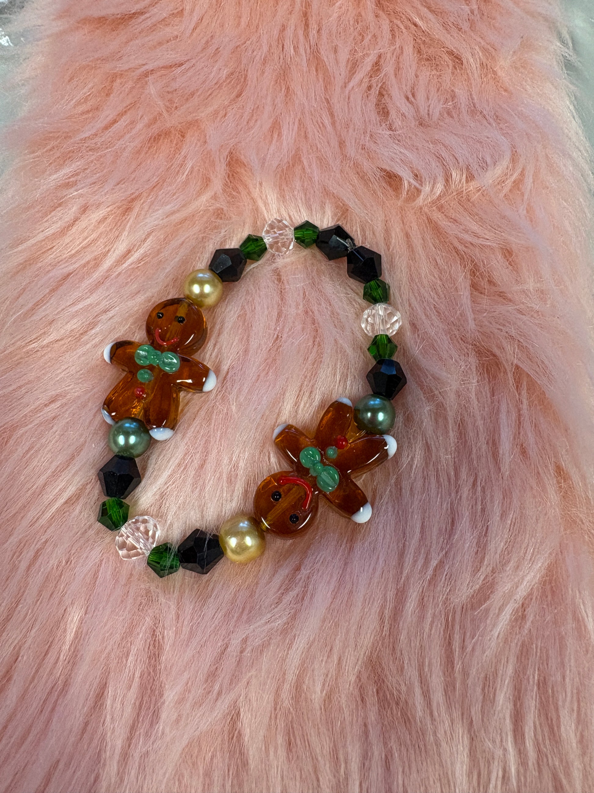 Add a dash of holiday cheer to your jewelry collection with this Gingerbread Man Lampwork Glass Beaded Stretchy Bracelet. This festive bracelet features two handcrafted lampwork glass gingerbread men, each detailed with colorful accents that bring their cheerful expressions to life. Surrounding the gingerbread men are a mix of faceted glass bicone and rondelle spacer beads in shades of green, black, gold, and clear—adding a touch of sparkle and texture to your wrist. The stretchy design ensures a comfortable fit for most wrist sizes, making it perfect for both everyday wear and festive occasions.