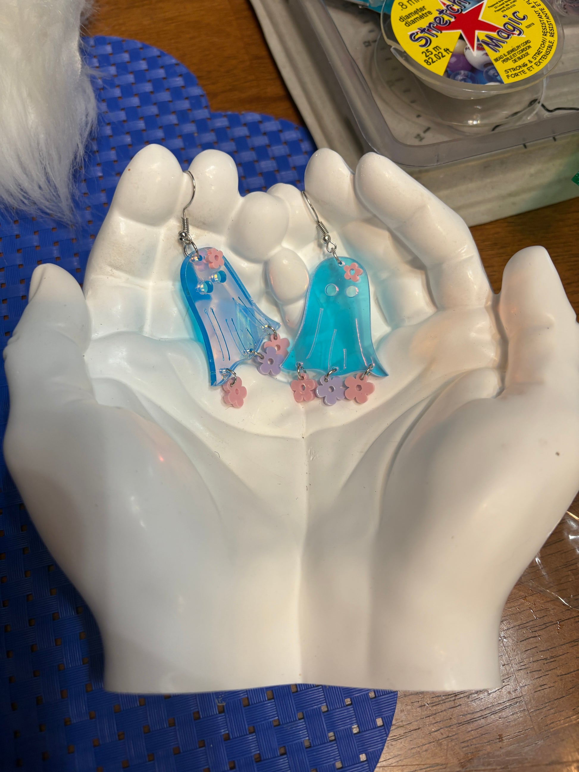 Add a playful twist to spooky season with these Groovy Ghost & Flower Dangle Earrings! These whimsical wire earrings feature translucent blue ghost charms adorned with pastel pink and lavender flower accents. The dangling floral charms add movement and a retro vibe, making these earrings perfect for Halloween parties, festivals, or everyday fun for those who love quirky accessories.