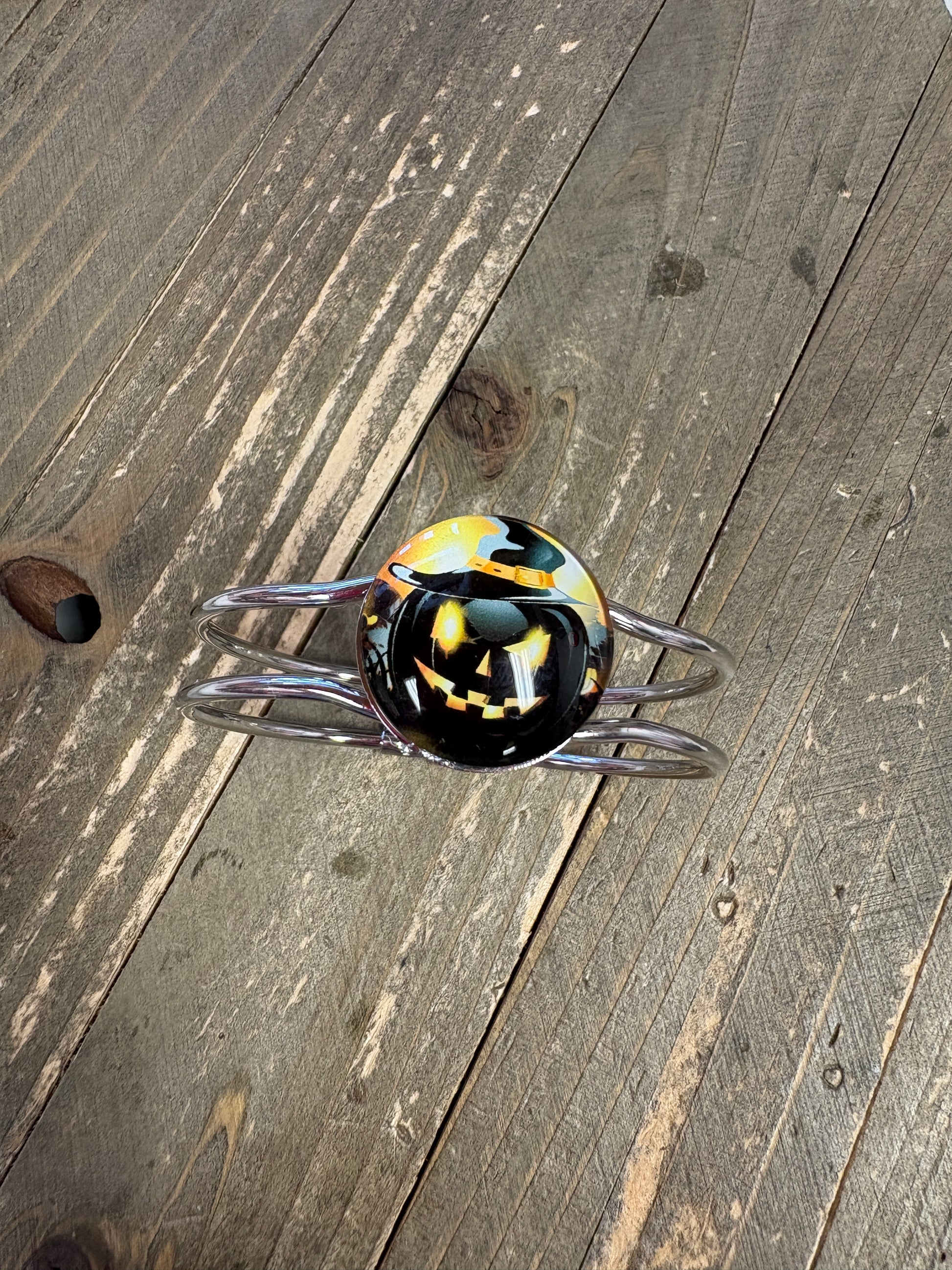 Add a spooky yet stylish touch to your outfit with this Jack-O’-Lantern Hinged Bracelet. Featuring a glossy glass cabochon centerpiece with a glowing jack-o’-lantern face, this bracelet is set on a sleek silver-tone hinged band for easy wear. Perfect for Halloween festivities, themed parties, or simply showcasing your love for spooky season, it’s a fun accessory that stands out. The hinge design allows for a comfortable fit while keeping the bracelet secure on your wrist.