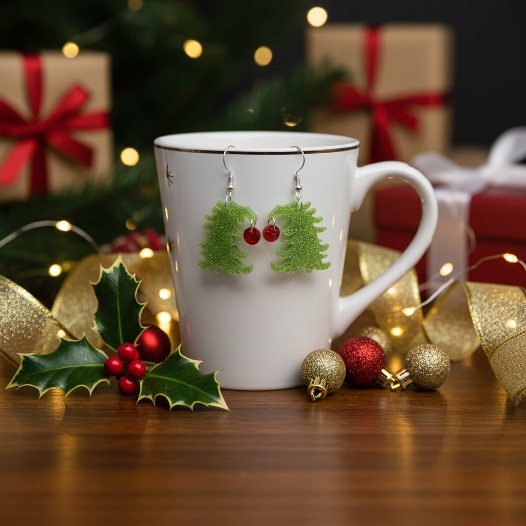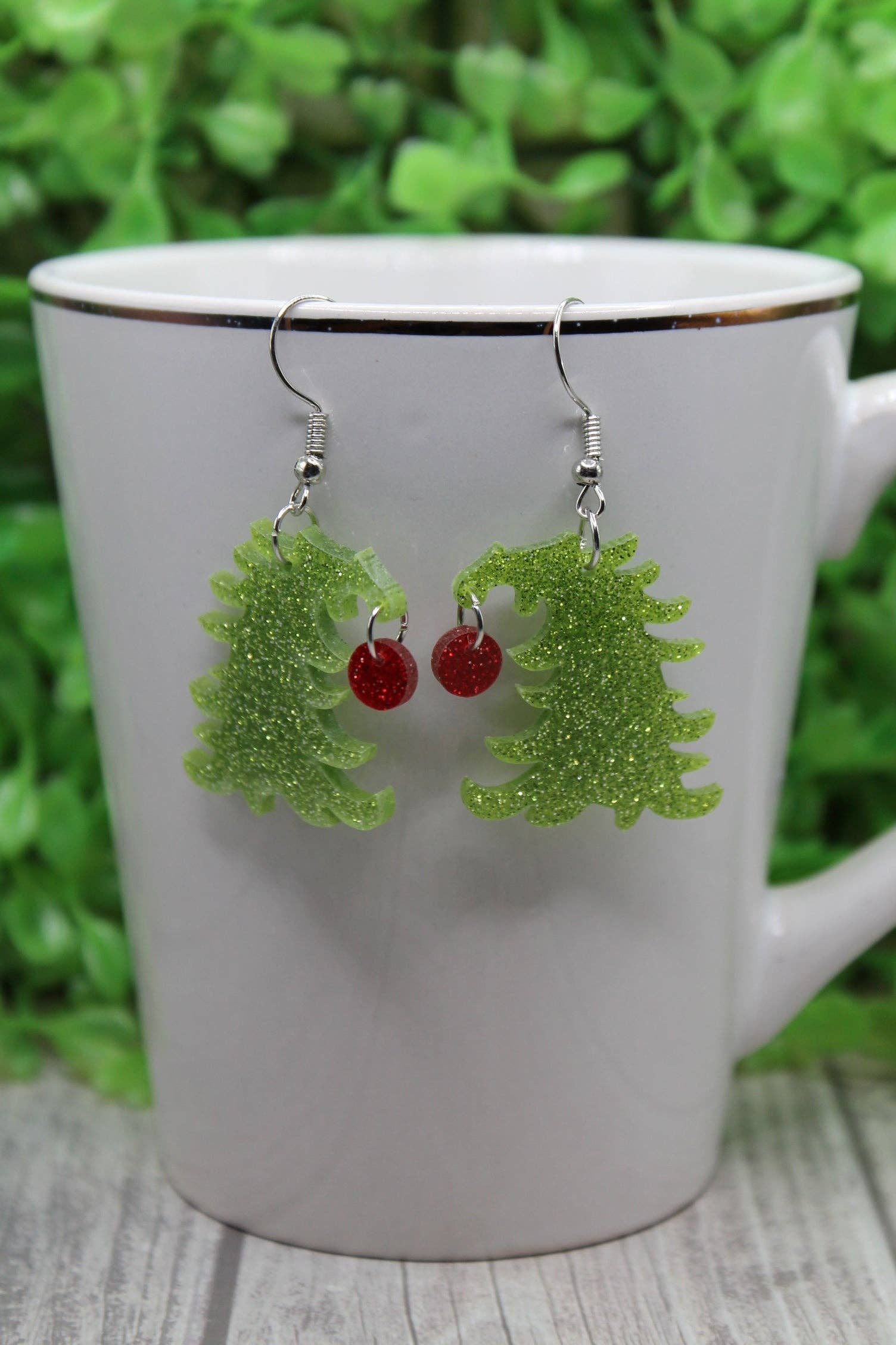 grinch earrings, christmas tree earrings, glitter holiday jewelry, acrylic dangle earrings, grinch christmas accessories, whimsical holiday earrings, handmade festive jewelry, nickel free christmas earrings, hylidae boutique earrings