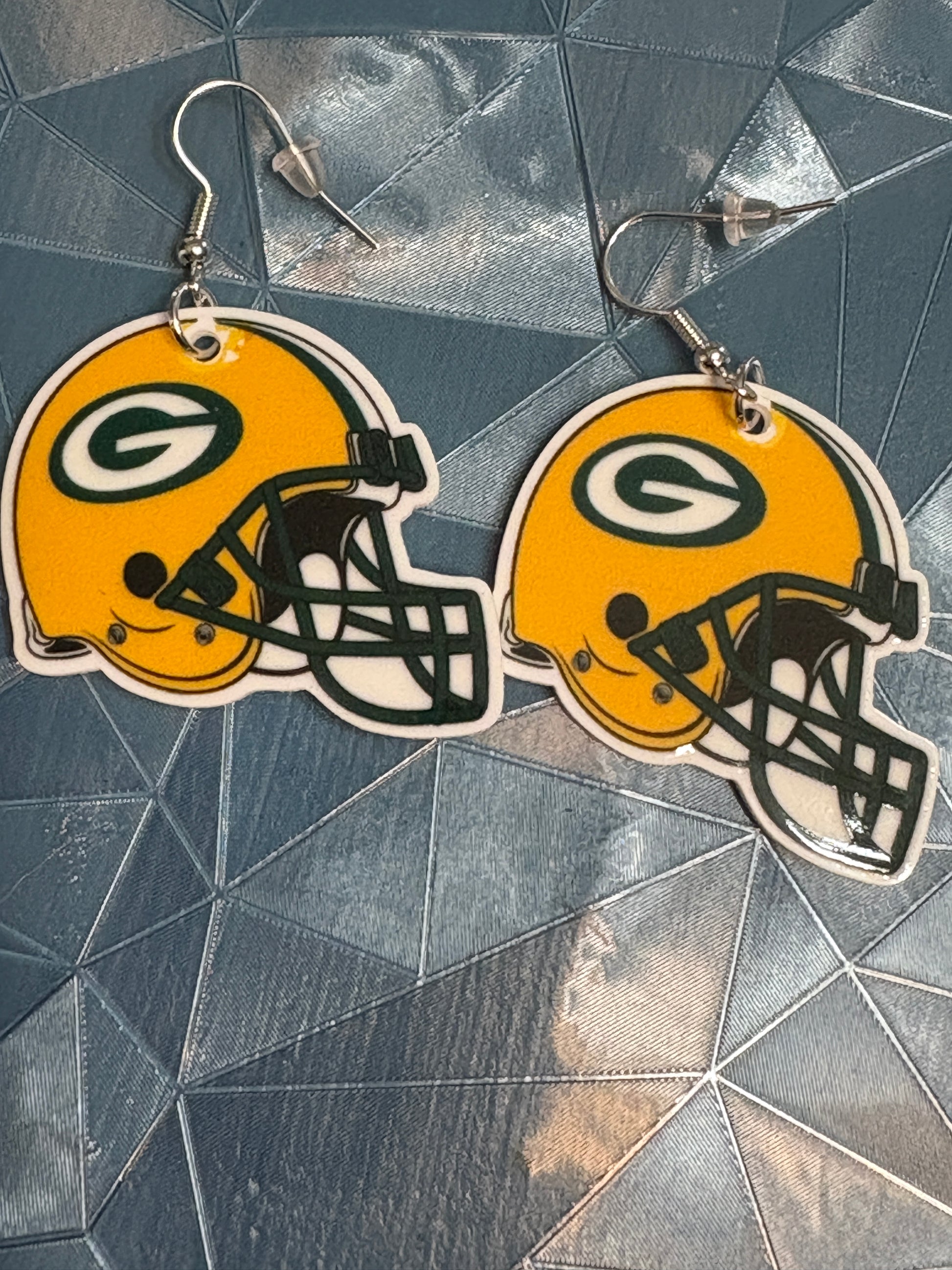 Green Bay Football Helmet Earrings – Game-Day Acrylic & Stainless Steel Fan Jewelry