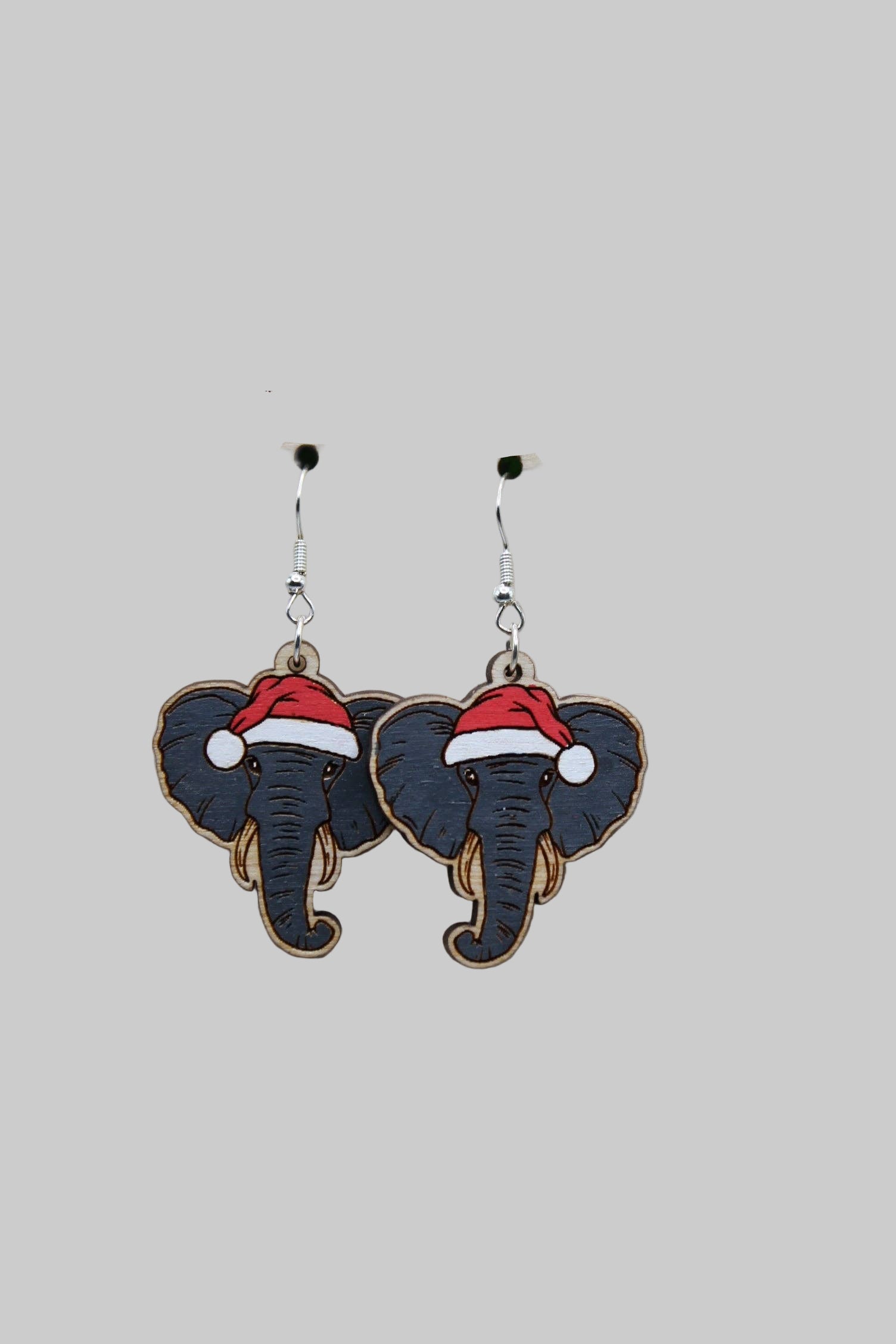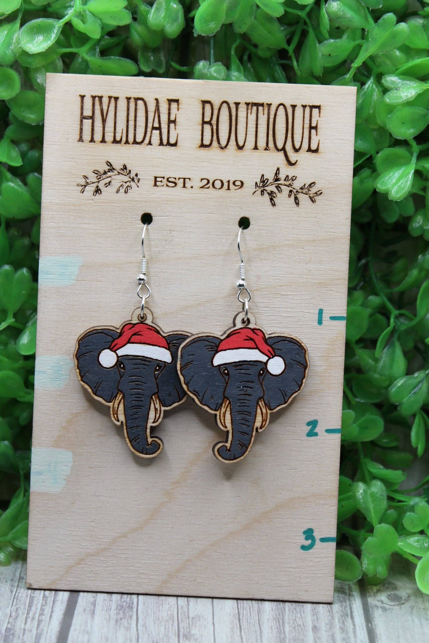 wooden Christmas earrings, elephant earrings, handmade holiday jewelry, animal Christmas accessories, wood dangle earrings, Hylidae Boutique jewelry, eco-friendly earrings, festive elephant gift, hypoallergenic earrings, handcrafted holiday jewelry