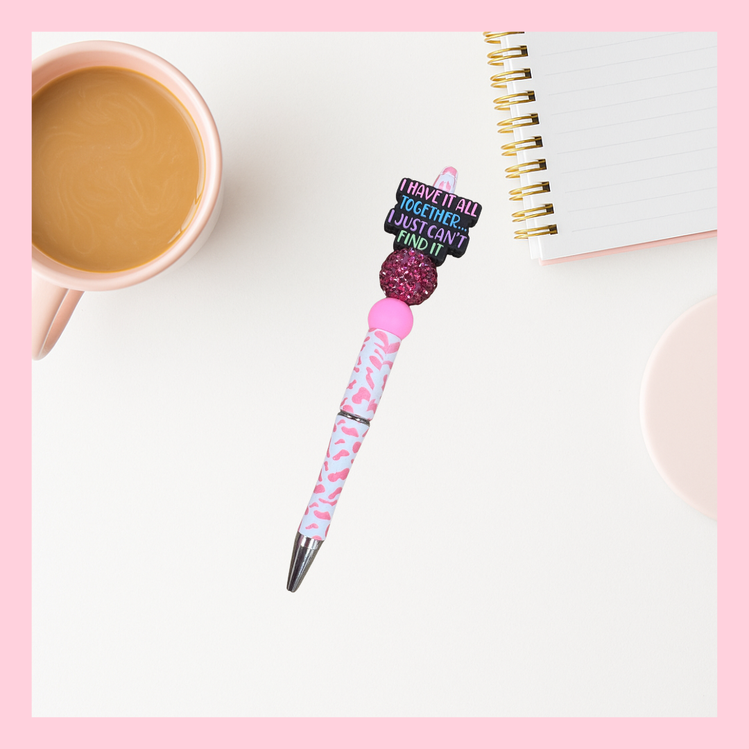 Bring a little humor and sparkle to your writing with this beadable pen! Featuring a bold statement charm that reads “I have it all together… I just can’t find it”, this pen is accented with a glittery pink rhinestone bead, smooth silicone bead, and a fun pink leopard print barrel. Perfect for teachers, office workers, or anyone who loves a mix of sass and style in their stationery. 🖊️💖