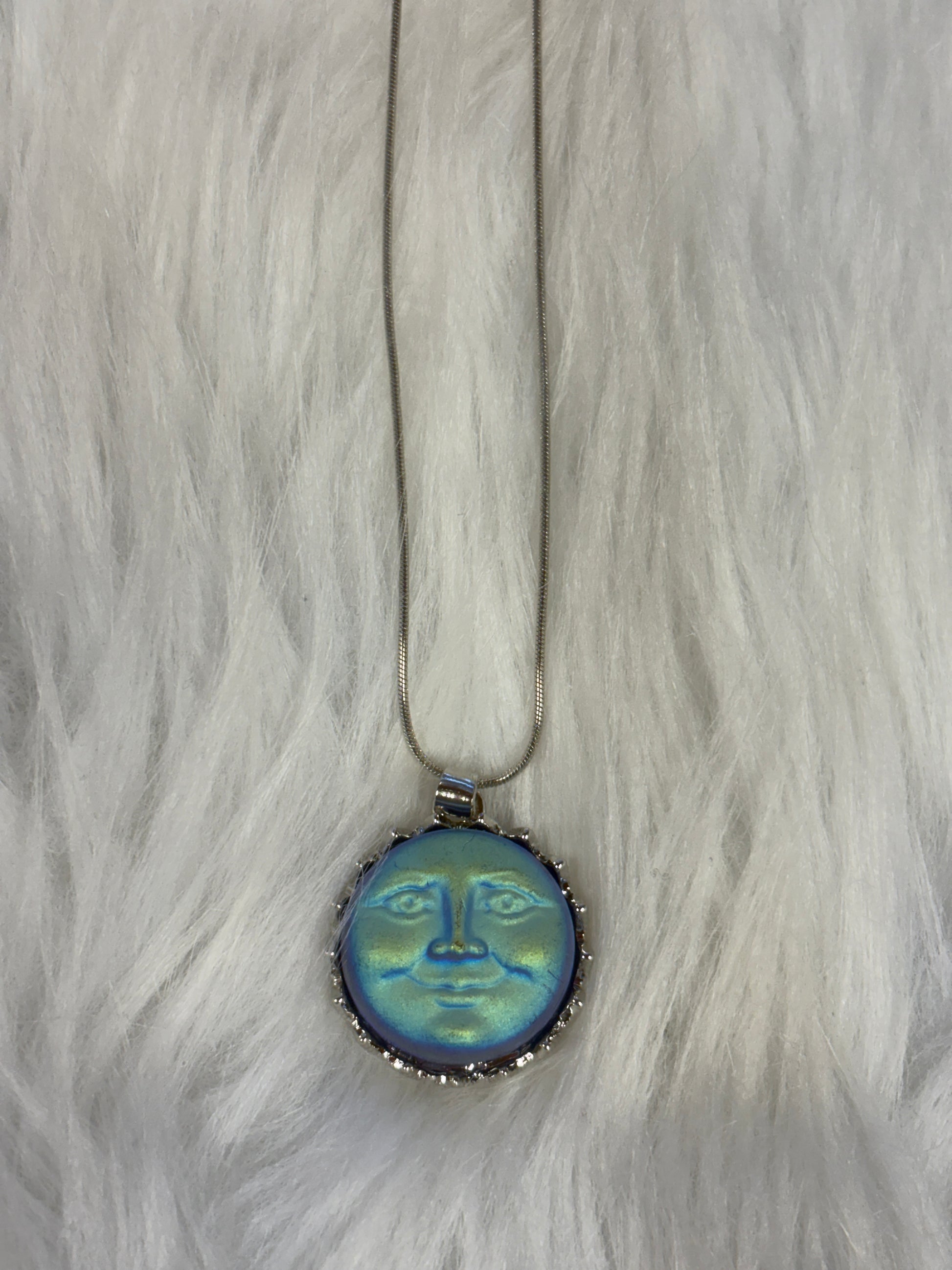 Capture a little piece of the night sky with this enchanting Iridescent Blue Moon Face Pendant Necklace. The round glass pendant glows in shifting shades of blue and green, creating a dreamy, celestial shimmer with every movement. Set in a silver-tone frame adorned with tiny triangular rays, the moon’s serene face feels both mystical and comforting—perfect for stargazers, dreamers, and anyone who loves magical, sky-inspired jewelry.