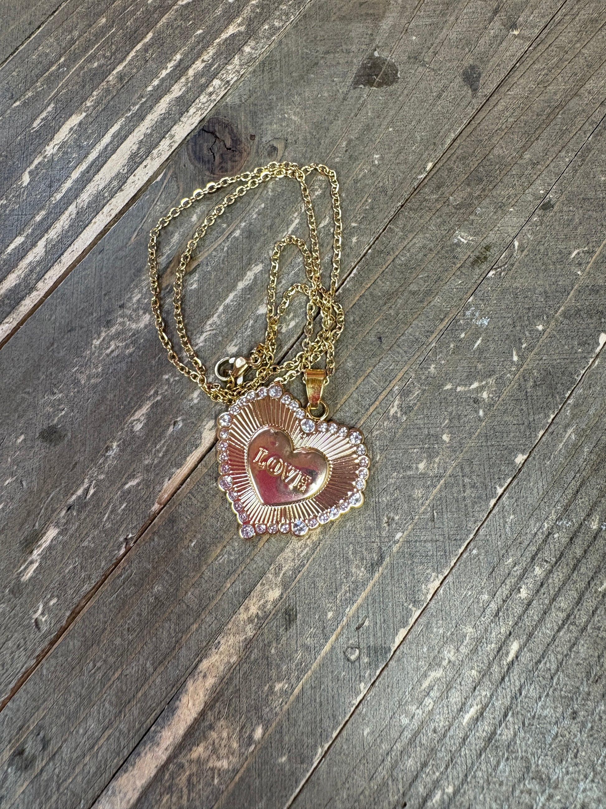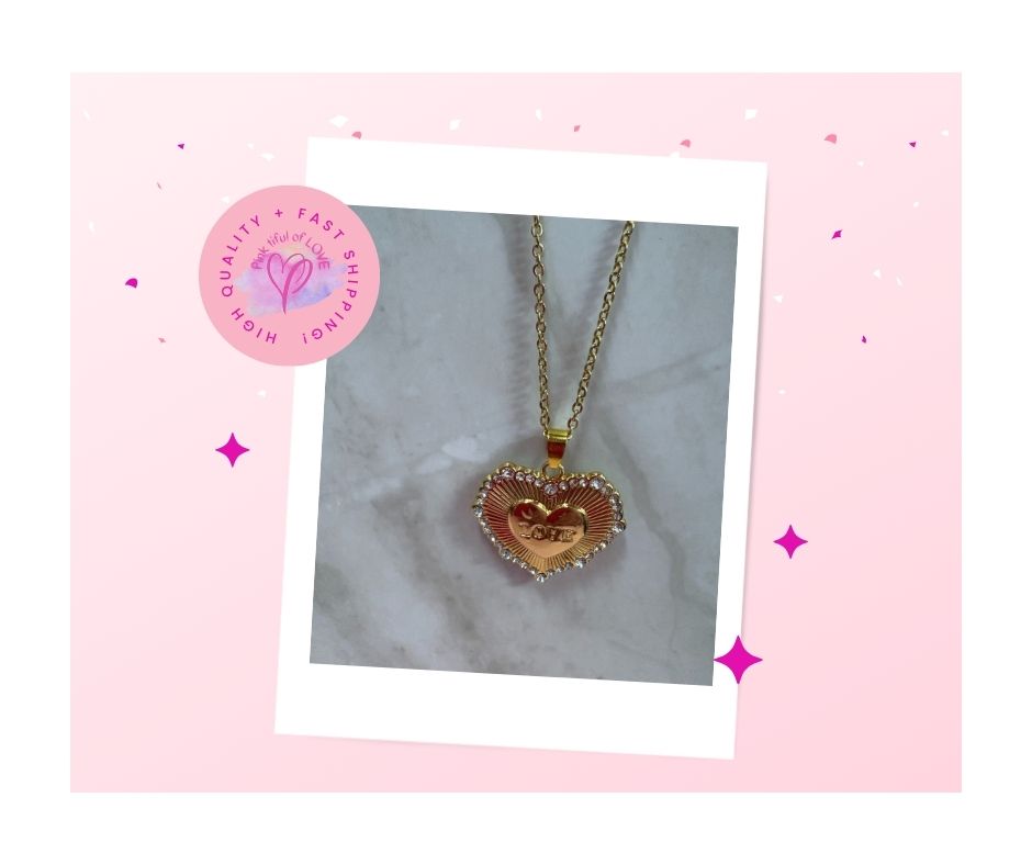 Add some love to your wardrobe with this stunning Love Heart Pendant on a Gold Chain Necklace. The 14K Heavy Gold Plated pendant features a dainty rhinestone border and a smaller etched heart with the word "Love". The dainty gold chain adds a touch of shine.
