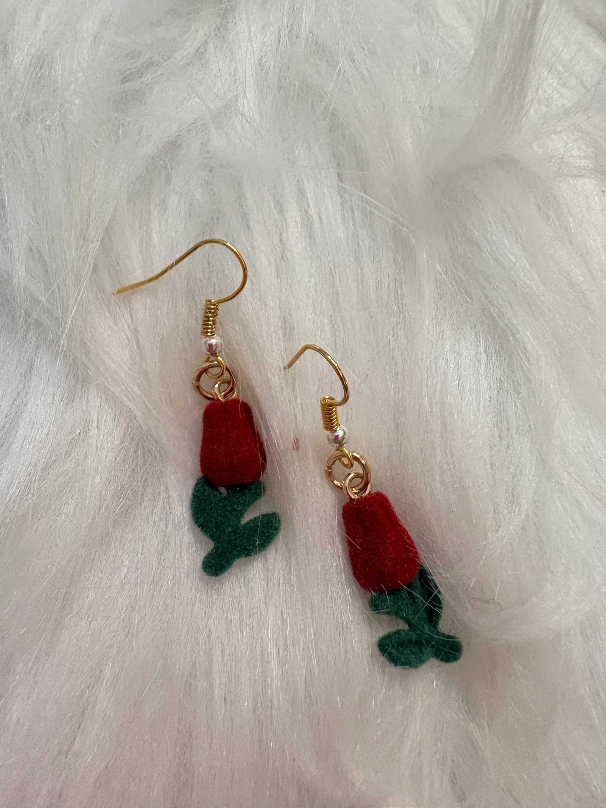 Red Rose Charm Wire Earrings – Flocked Floral Dangle Earrings in Gold