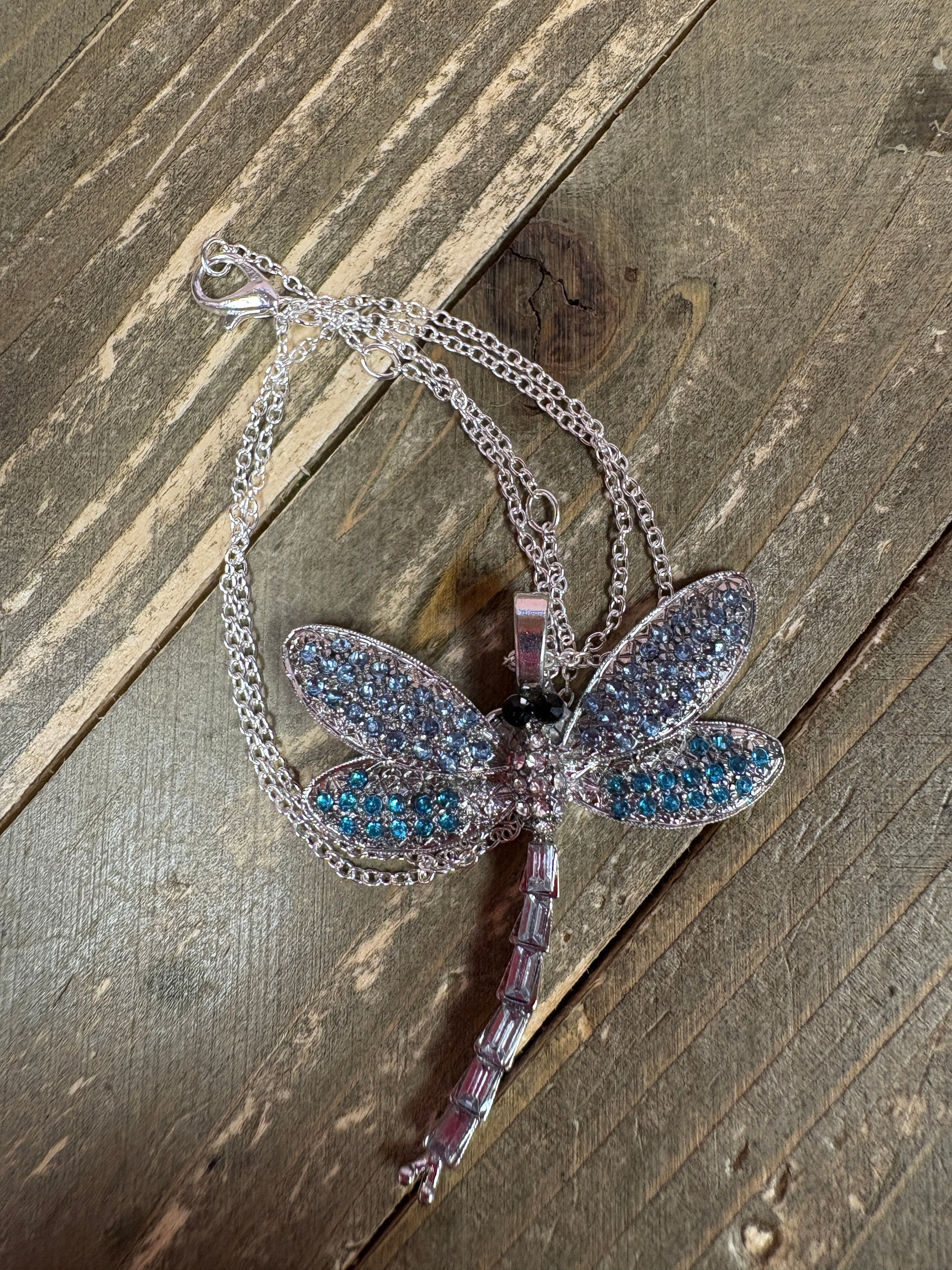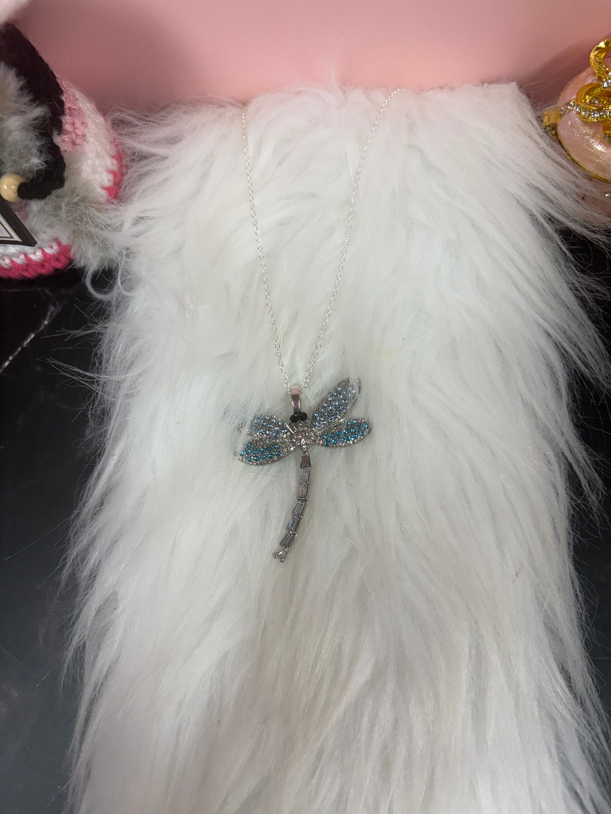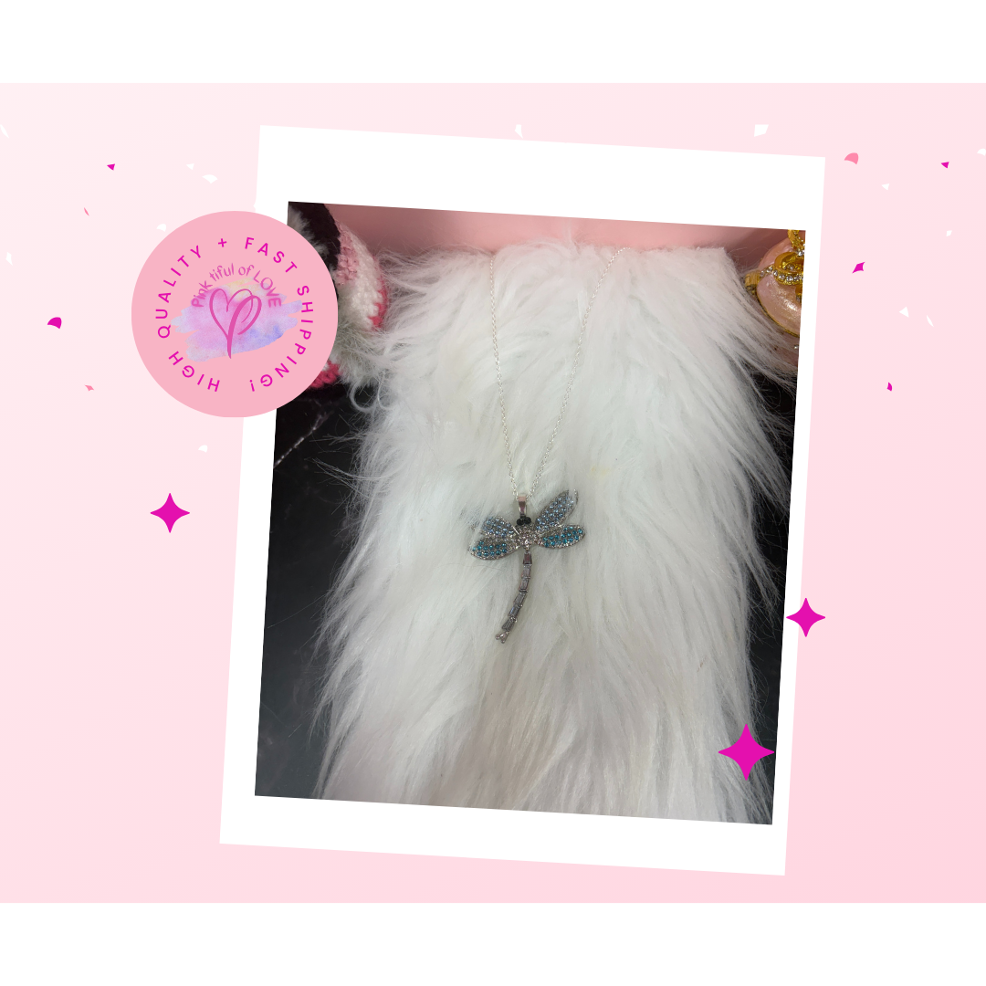Add a whimsical touch of elegance to your style with this dazzling dragonfly pendant necklace. The pendant is beautifully detailed, showcasing shimmering blue and clear stones across the dragonfly’s wings and body, creating a sparkling, eye-catching effect. Suspended from a delicate silver chain, this piece captures the light from every angle, making it the perfect accessory to elevate both everyday looks and special occasion outfits.