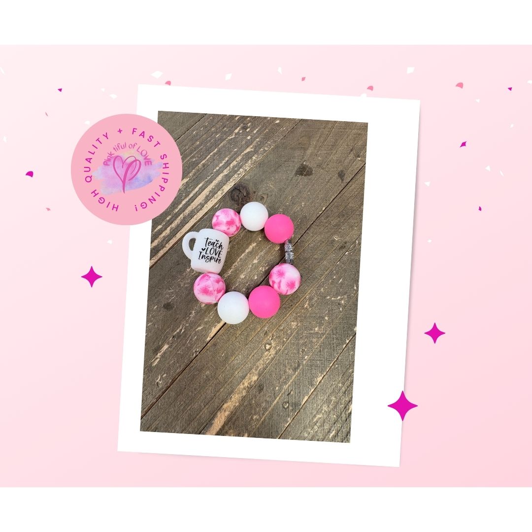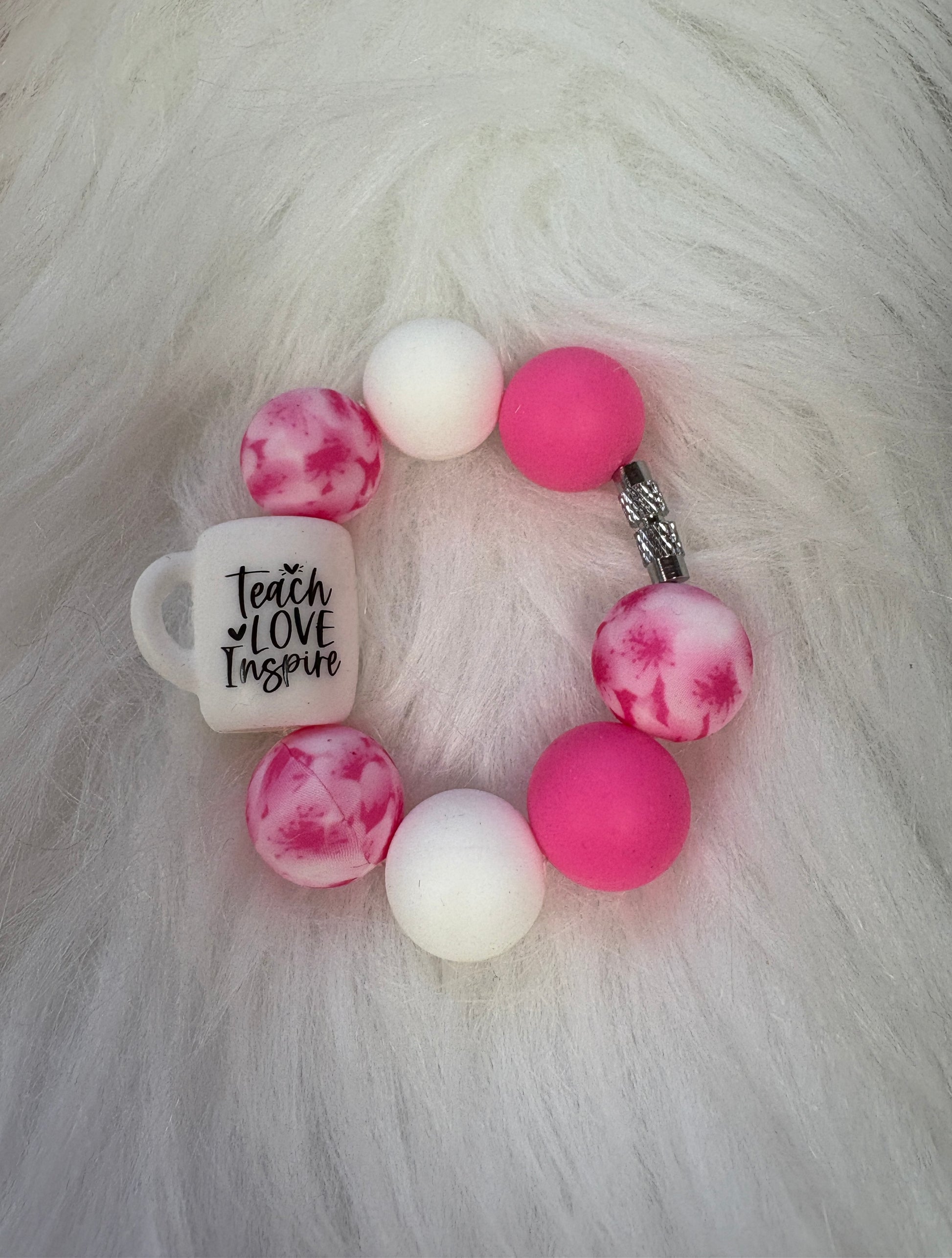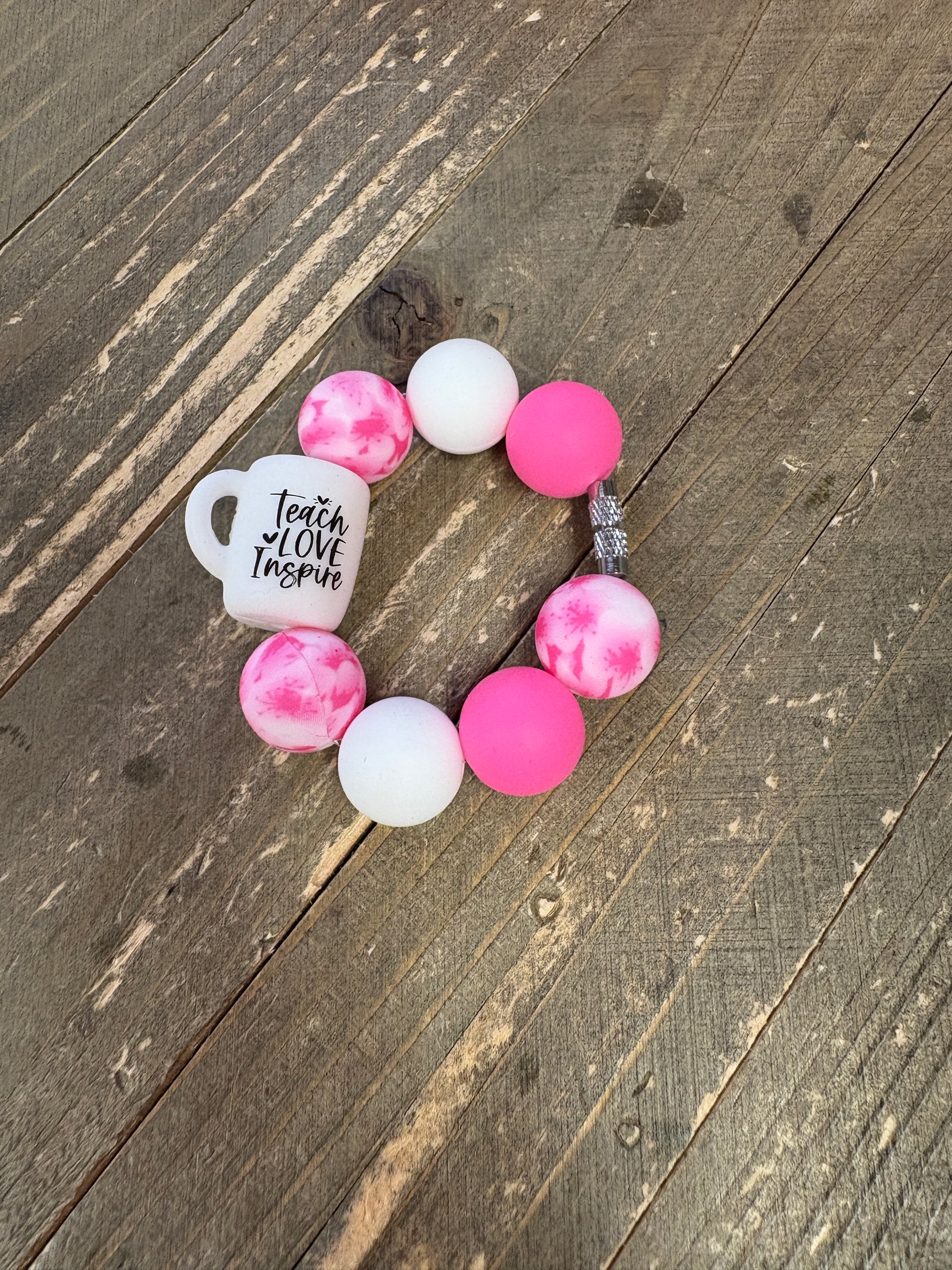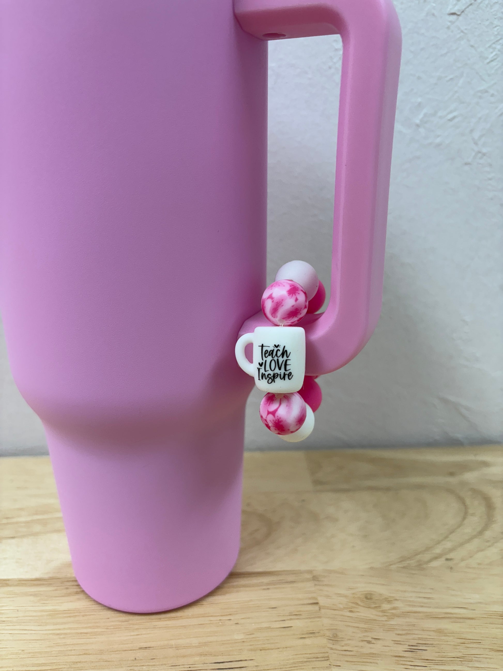 Add a sprinkle of charm to your drink with this Teacher Beverage Cup/Tumbler Charm! This delightful handmade accessory features charming pink swirls, neon pink & white silicone beads, with an adorable Coffee mug silicone bead that has Teach, Love Inspire on it stealing the spotlight. Perfect for both gifting and personal flair, this one-of-a-kind fashion piece ensures your tumbler stands out in style. Ideal for special occasions like birthdays or just because, it’s a funky gift that shows you care. With fast shipping and satisfaction guaranteed, elevate your beverage game today!