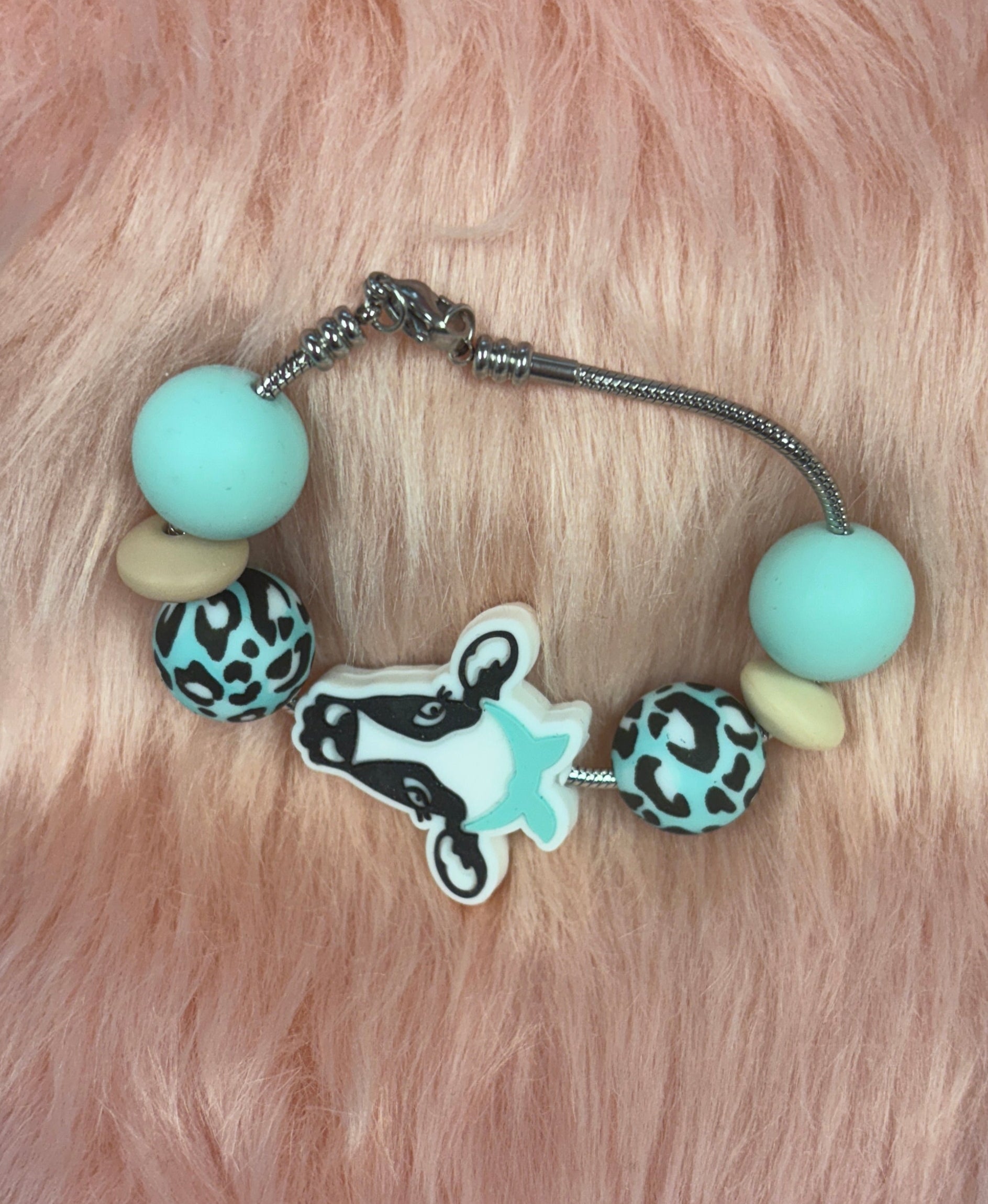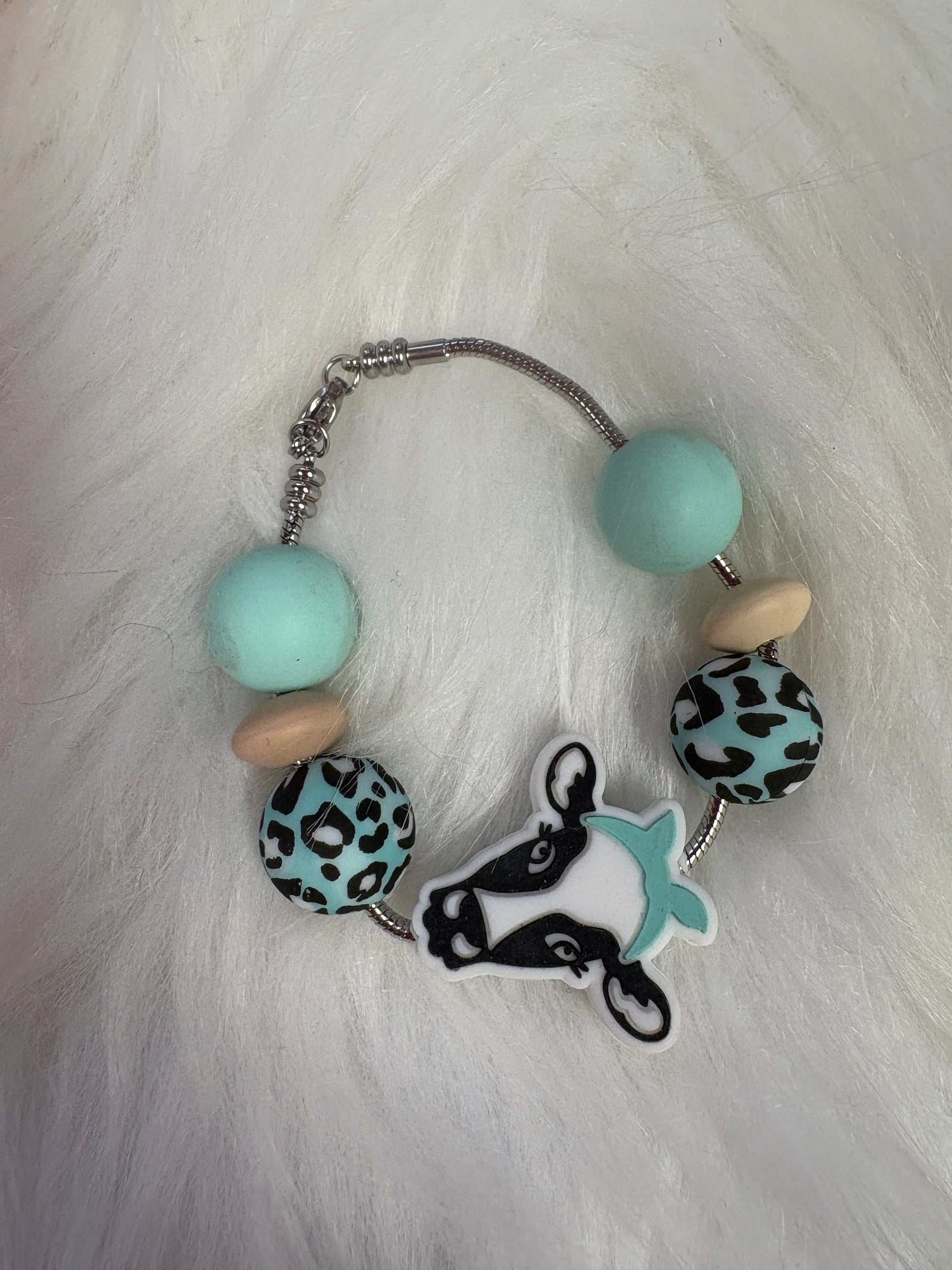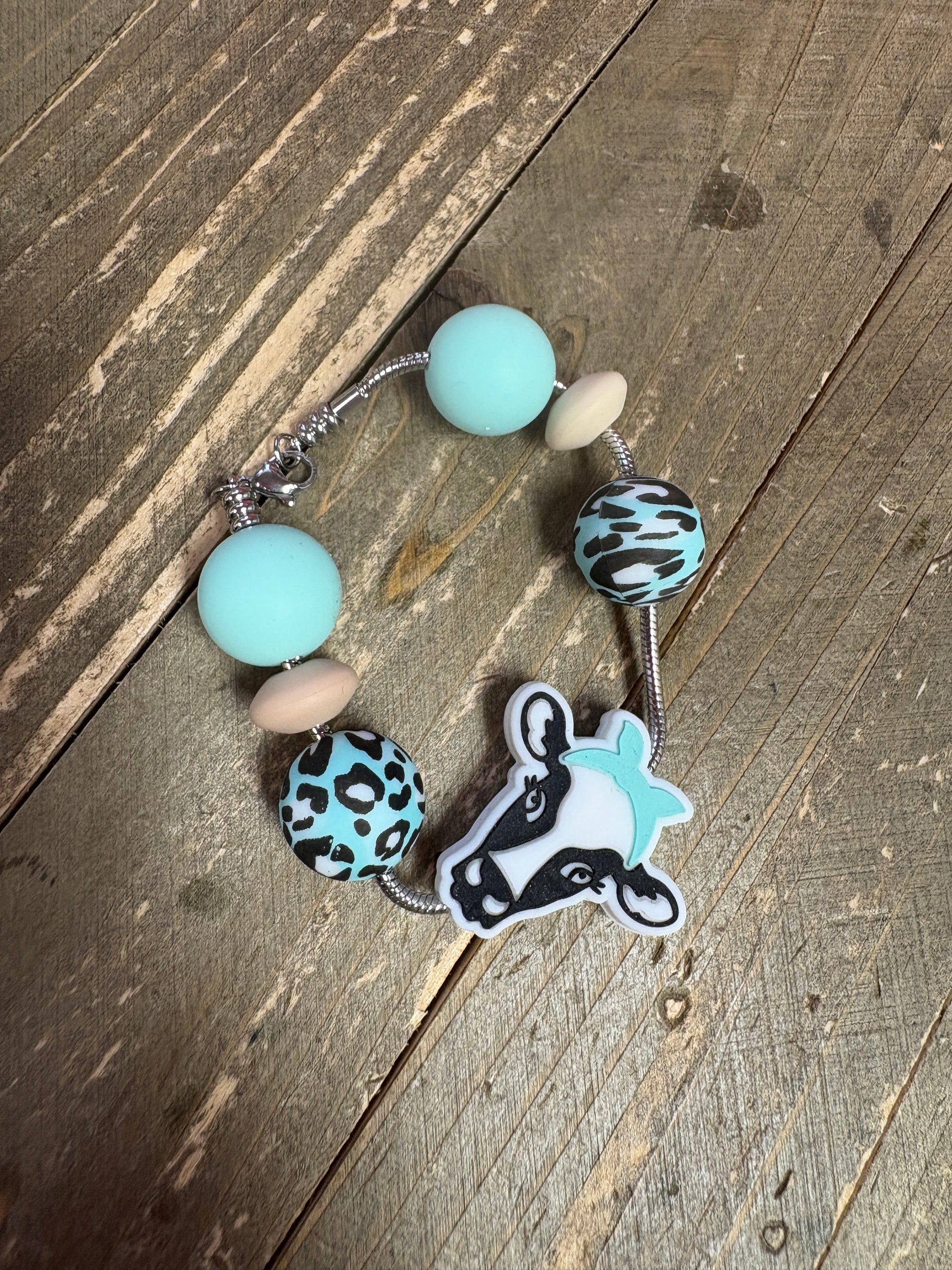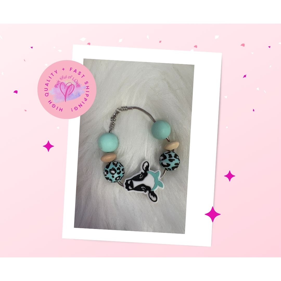 Add a sprinkle of charm to your drink with this Cow with a Teal bow Beverage Cup/Tumbler Charm! This delightful handmade accessory features charming teal and tan silicone beads, with an adorable Cow wearing a teal colored bow stealing the spotlight. The beads are strung on 7" snake chain with lobster claw for easy adding beads. Perfect for both gifting and personal flair, this one-of-a-kind fashion piece ensures your tumbler stands out in style. Ideal for special occasions like birthdays or just because, it’s a funky gift that shows you care. With fast shipping and satisfaction guaranteed, elevate your beverage game today!