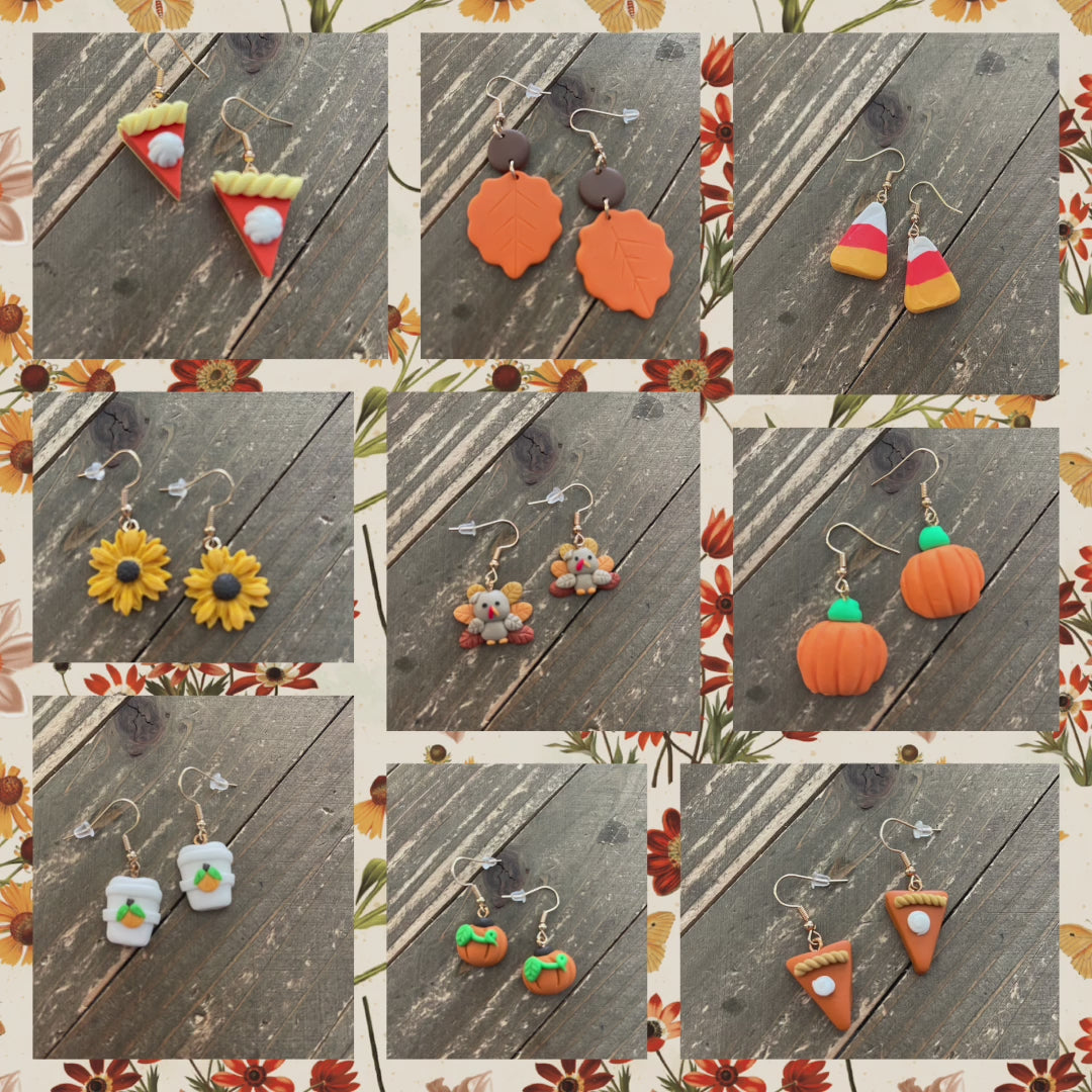 Get into the Thanksgiving spirit with this COLLECTION Wire Earrings! Choose from 9 festive designs, including pumpkin pie, pumpkins, maple leaf, candy corn, sunflower, turkey, and coffee to go. Made with silver plated wires and lightweight polymer clay for a comfortable wear. Perfect for adding a playful touch to your fall outfits.