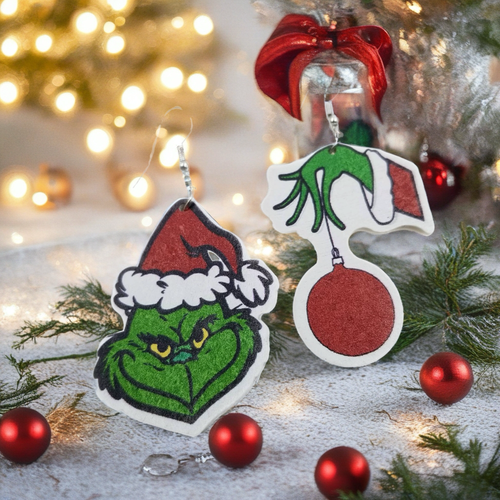Grinch Christmas Asymmetrical Wood Earrings | Fun Holiday Statement Earrings
